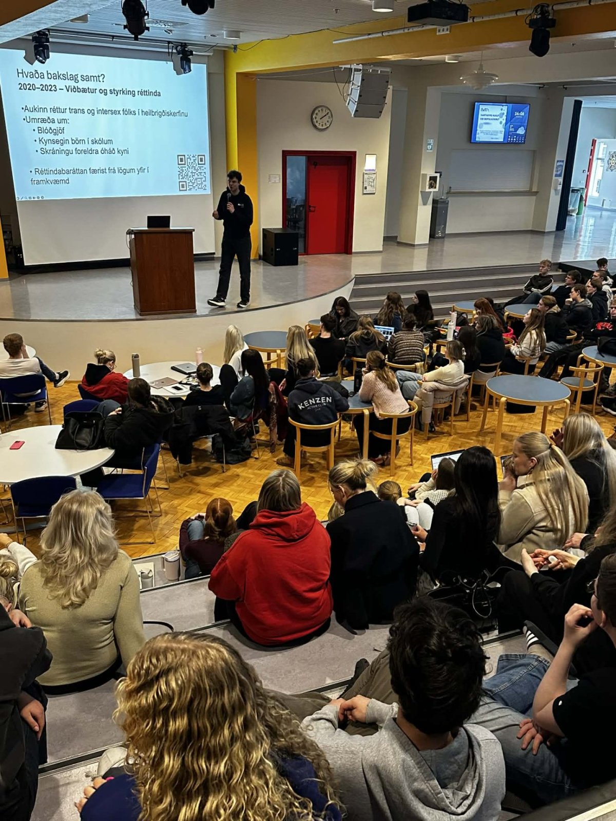 Nú í dag var hringt á sal og nemendur komu saman í Kvosinni og hlustuðu á fyrirlestur Aðalbjörns Jóhannssonar, en hann fjallaði um ýmislegt sem tengist hinseginleikanum, fordómum og bakslagi í réttindabaráttu hinsegin fólks. Aðalbjörn er nemandi í HA og er stýri hinsegin félags stúdenta á Norðurlandi. Til gamans má geta að hann vinnur einnig á heimavist MA og VMA.