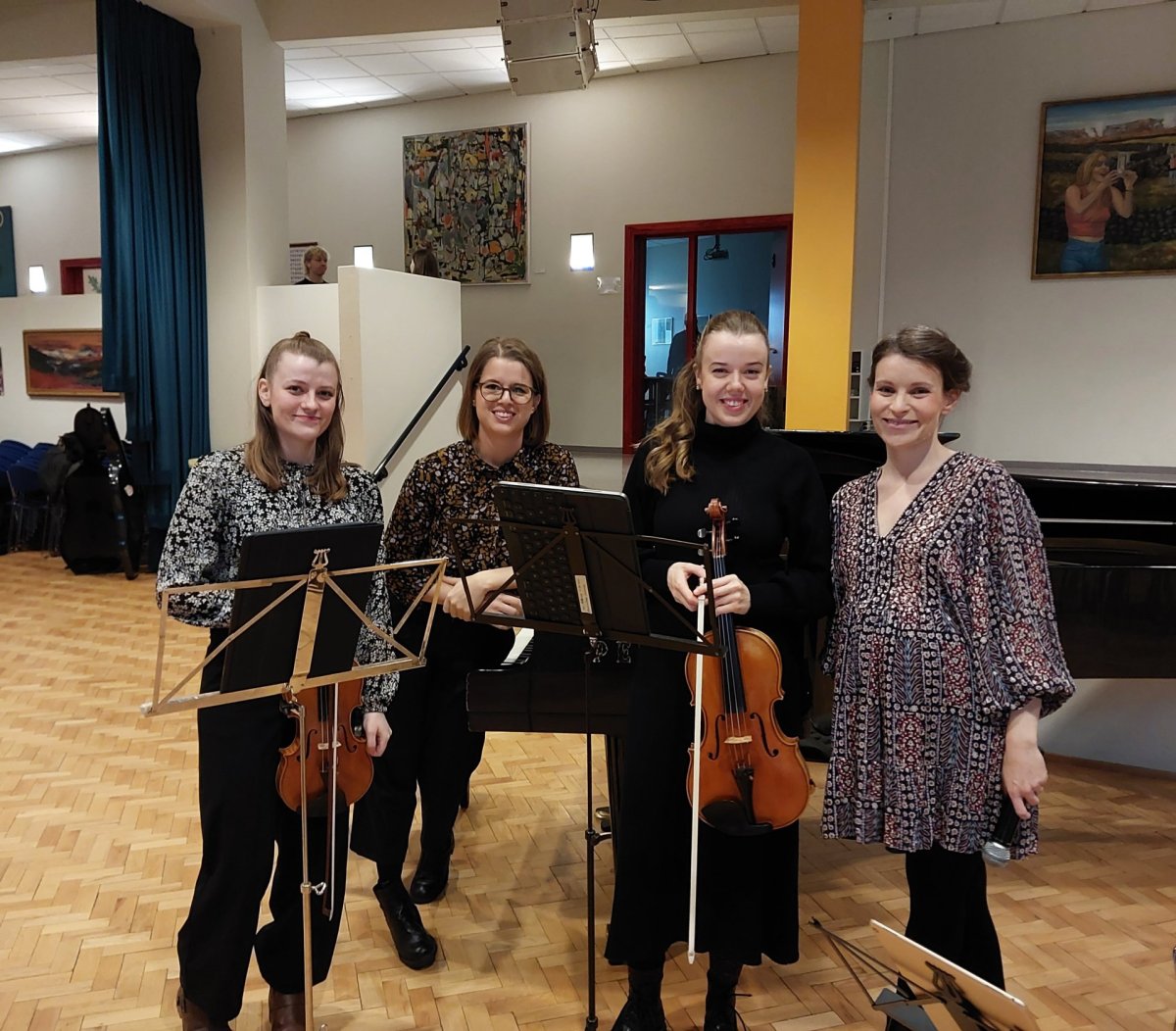 Kvartettinn fékk styrk frá Akureyrarbæ til að spila tónleika í Hofi og koma auk þess fram á hjúkrunarheimilum og í skólum bæjarins. Þar sem það eru tveir fyrrum MA-ingar í kvartettinum, þær Hrafnhildur Marta og Þóra Kristín, vorum við svo heppin að þær vildu koma og spila örtónleika í sínum gamla skóla.